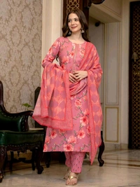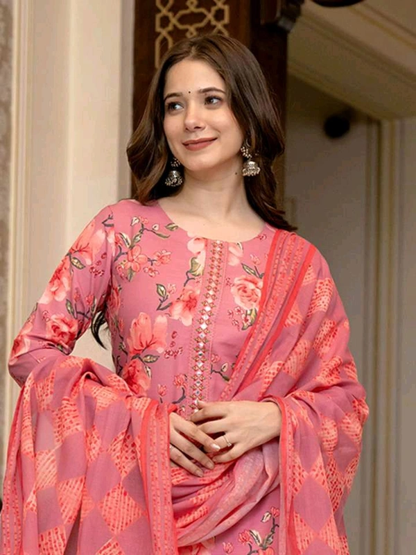 AHIKA Floral Printed Mirror Work Straight Kurta with Trousers & Dupatta