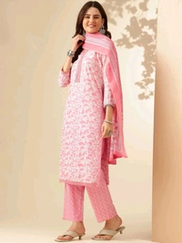 Crafted with meticulous attention to detail, this kurta set combines a rustic pink hue with delicate floral prints and intricate thread work, making it a true embodiment of grace. Its pure cotton fabric ensures breathability and comfort, while the coordinated trousers and dupatta complete the look with effortless charm.