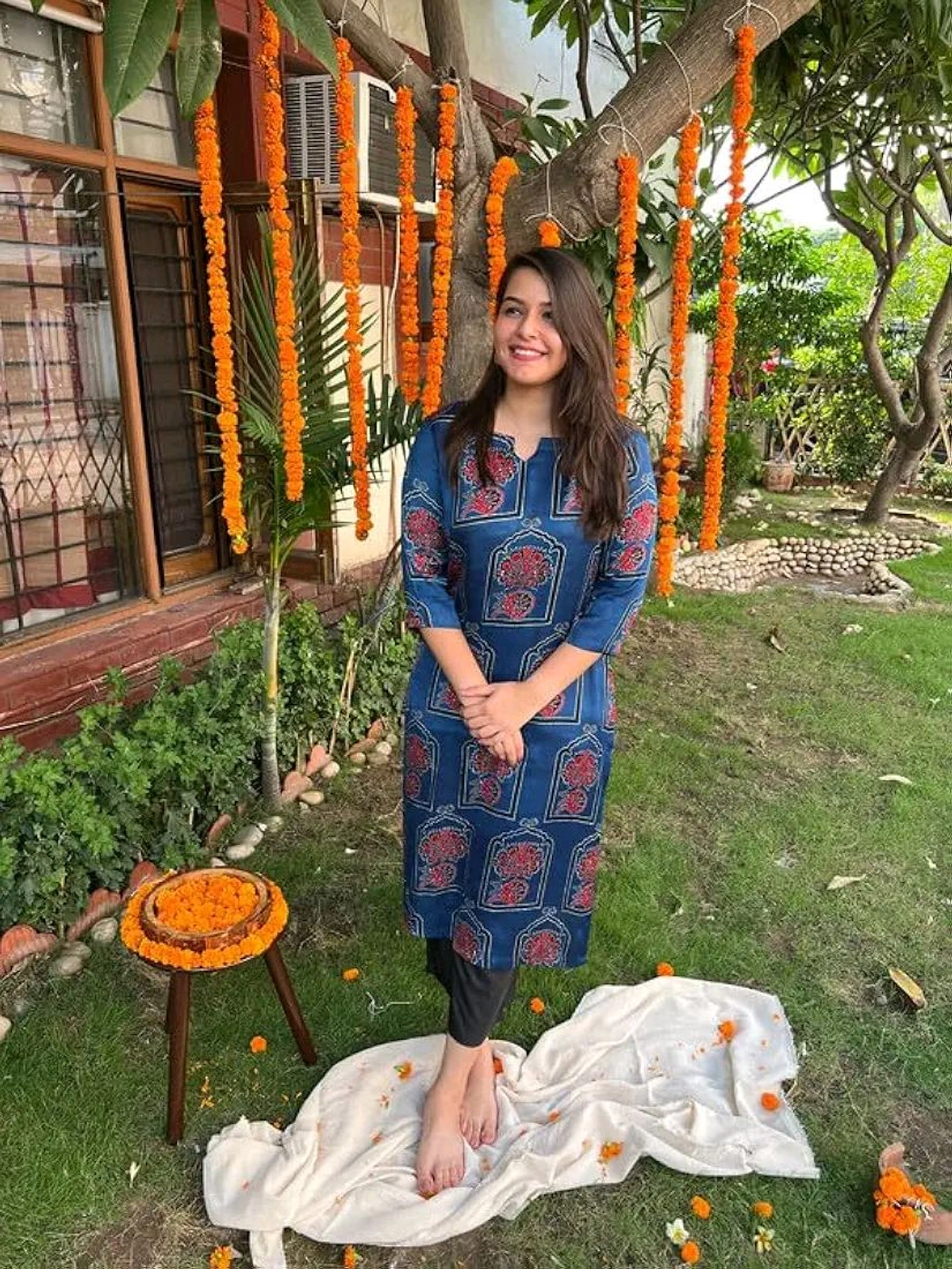 Rayon Blue Kurti with Pant, Block Print 3/4 Sleeves Knee Length Round Neck Kurta Set for Women & Girls