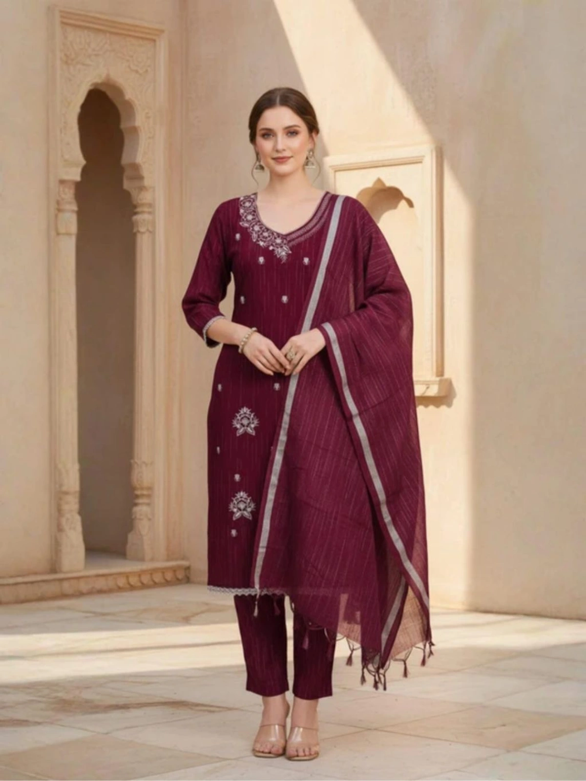 - Complete Ensemble: Includes a beautifully tailored kurta, matching pants, and a graceful dupatta, giving you a cohesive and polished look.